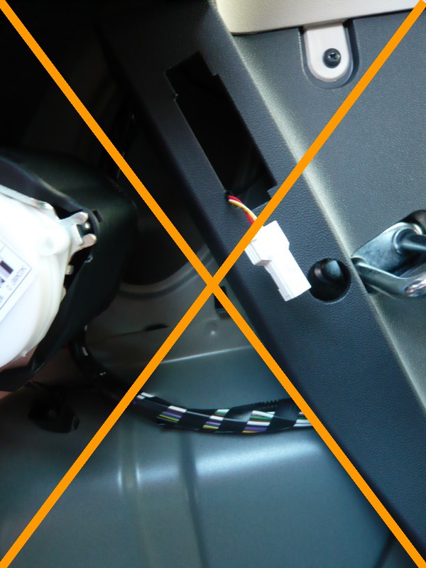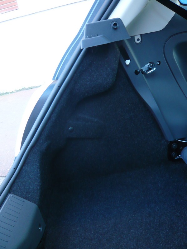 Il y a un petit trou dans la moquette qui semble être fait pour ça: j'y a donc passé le câblage. Pour les distraits, attention: ne passez pas le câble comme indiqué sur l'image précédente si vous préférez suivre cette méthode-ci, ou vous serez coincés.