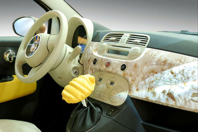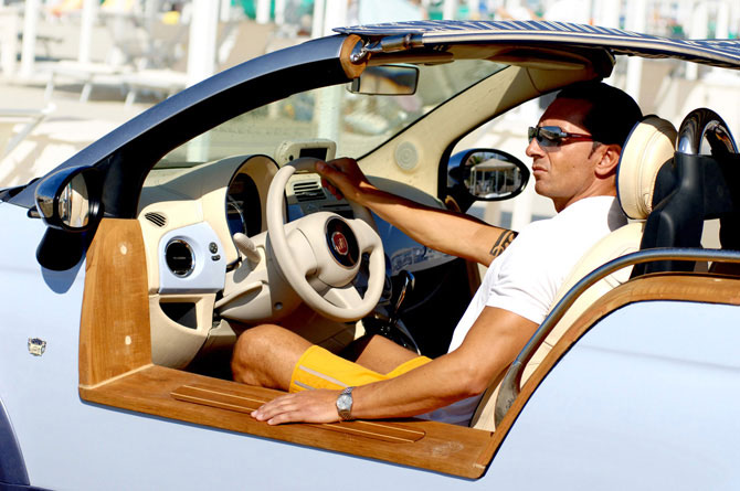 Les portes, hayon et le toit de la 500 ont été enlevées, tandis que les côtés seuil ont été surélevés et renforcés pour maintenir la rigidité structurelle. Un capot amovible en toile rouge rétro avec bandes blanches offre un abri à l'ombre. L'intérieur est fait en teck et osier.