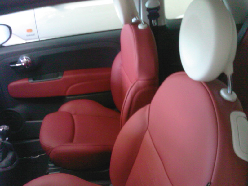 Bon, ça y est j'ai réussi à changer mes sièges, je passe du tissu en damier noir/blanc au cuir rouge. Je suis contente! Certes, le cuir serait plus beau si je le faisais mettre par la suite mais plus cher --> je m'explique: j'ai obtenu une réduction équivalent à 700€ donc le cuir me revient à 500€ du coup. Et puis, comme il sera d'origine, il sera garanti, donc tant qu'il ne sera pas parfait, ils m'y verront chez Fiat.
