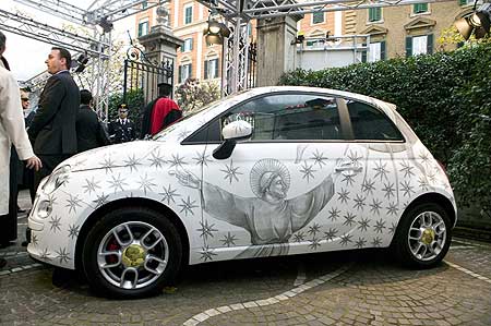 Je vous présente les Cinquecento d'autore présentées à Rome composée de Fiat 500 uniques peintes à l'effigie de saints, poètes et navigateurs.