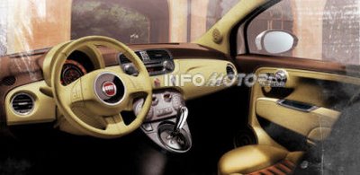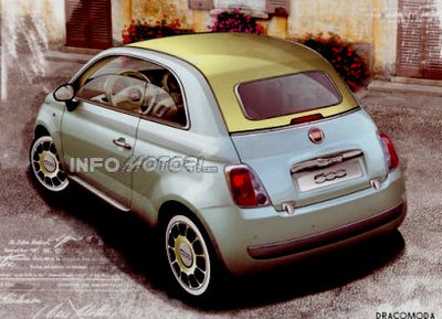 | Dans Autoplus de cette semaine (mardi 23 septembre), les journalistes semblent dire que la Fiat 500 Cabrio serait doté de deux arches et découvrable manuellement, ce qui simplifie son implantation et réduira les coûts puisque le prix d'entrée de gamme serait de 15 000 €. |
