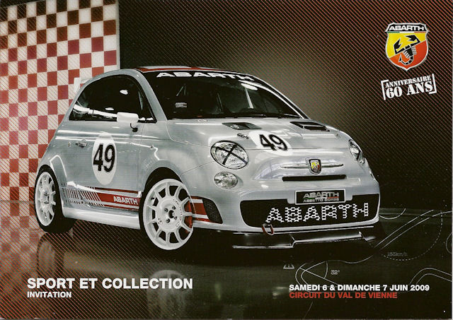 J'ai reçu, ce matin, une invitation envoyée par Abarth France concernant le week-end des 6 et 7 juin sur le circuit du Val de Vienne pour les 60 ans de la marque Abarth ! Joli programme mais je ne peux pas y aller, dommage. L'avez-vous reçue, vous aussi ?